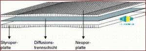 Das Dämmplatten-System THERMO-FLEX besteht aus 2 Platten (Styropor und Neopor), welche mit einer innenliegenden Diffusions-Folie verklebt sind!